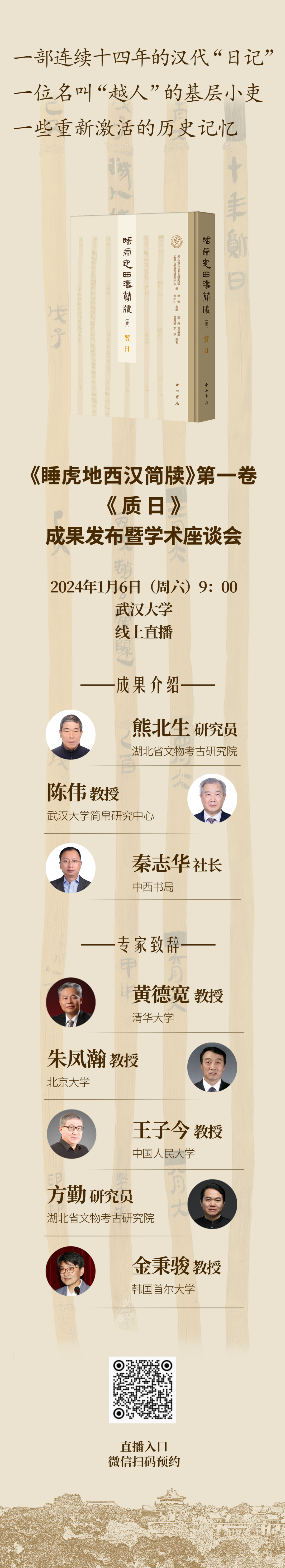 《睡虎地西汉简牍》以多卷本形式,收录云梦睡虎地77号西汉墓出土的以简牍为主的全部资料。首卷《质日》著录从文帝前元十年(前170)至后元七年越人记写的14个年份的《质日》。质日是秦汉时期流行、但后世失传的一种文献形式。通常以年历为基础,简要记录公私事务,类似后世的日志、日记。通过这批《质日》的解读,可以复原当时的历法、时令,了解越人及其同事、家人的事迹,研究乡亭、户算等重要制度。