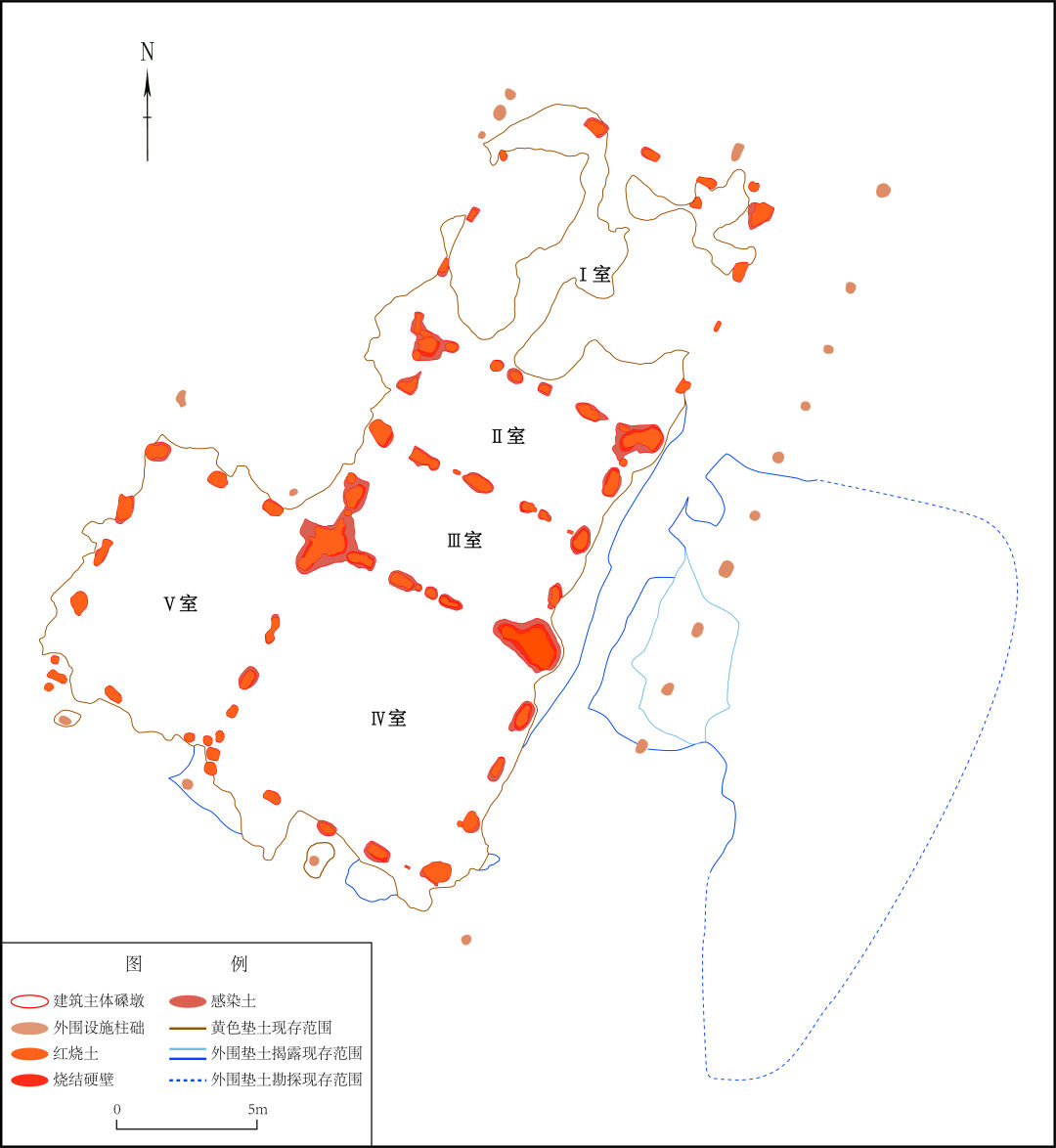 2021年至2023年的考古工作,确认屈家岭南部台地存在以F38为代表的屈家岭文化高等级建筑区。揭露一座面积约510平方米的屈家岭文化大型建筑F38。平面整体呈东北至西南向,自北向南分为四间,南端向西折出一间,依据建筑形制及特征,推测其为一处公共礼制性建筑。主体面积约340平方米,外围设施(或为廊道)现存面积约170平方米,依使用面积计算,I室至V室分别约为79、27、27、79和50平方米。发现有黄土台基和数量众多、体量巨大、建造工艺考究的“磉墩”,是已发现“磉墩”的最早形态,为中国古代土木建筑技术提供了坚实的考古学依据,填补了中国建筑史的空白。大型建筑F15和F18、仓储类建筑F17和红烧土广场,皆位于F38的北部,它们与F38都处于同一地层单位,年代均为屈家岭文化早期晚段,共同构成了屈家岭文化高等级建筑区。值得关注的是,高等级建筑区的营造和熊家岭晚期坝的扩建,同时发生于屈家岭文化早期晚段,表明这一时期社会进入加速发展的阶段。